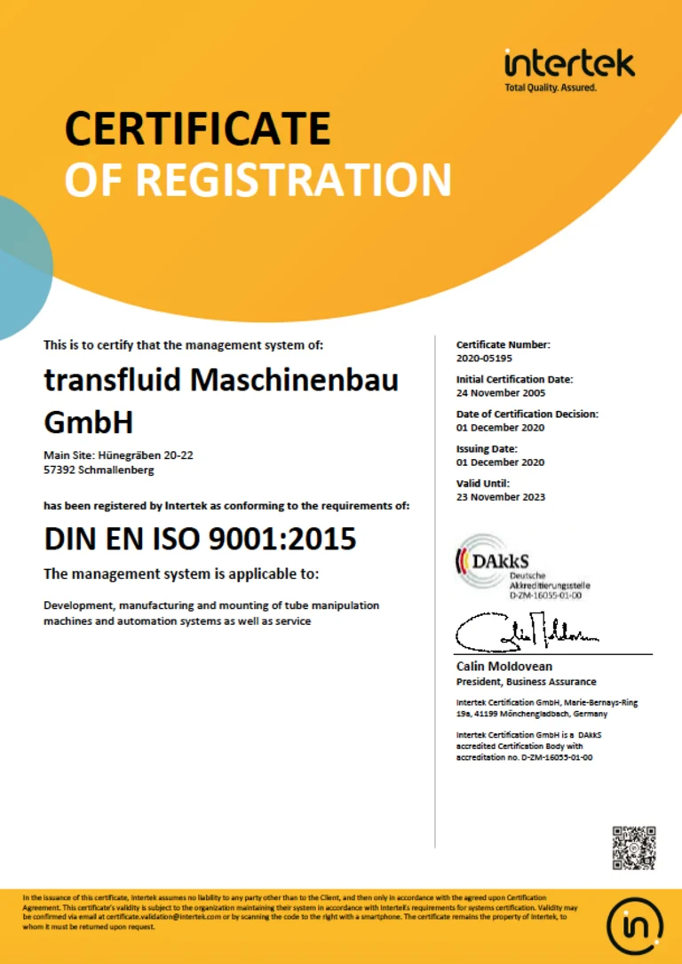 This certificate covers the development, manufacture and assembly of tube processing machines and automation systems as well as service.