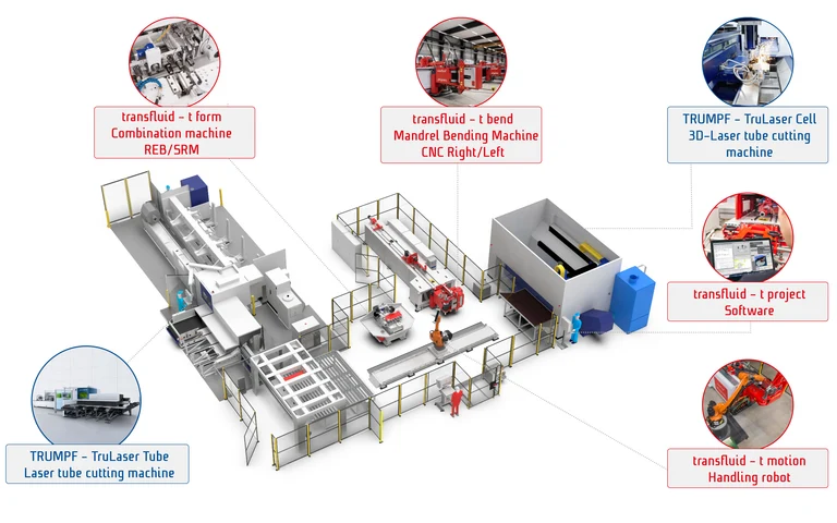 La partnership tra TRUMPF e transfluid® consente di combinare in modo estremamente flessibile i sistemi di taglio laser dei tubi con la tecnologia di curvatura/formatura dei tubi, nonché di realizzare concetti di produzione di tubi completamente automatizzati: