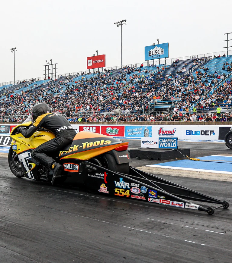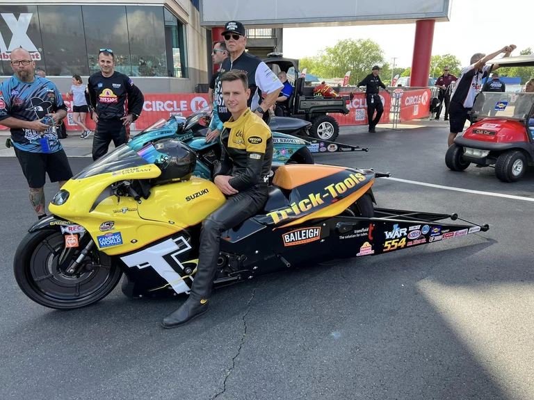 Van Sant began racing junior dragsters at the age of 9 at Eddyville Dragway in Eddyville, Iowa, and competed several times in Denver at the Western Conference Finals. At age 16 he started racing street bikes in brackets and heads up no-bar events. In 2018 Chase and his father Bruce decided to get Bruce’s ex-Pro Mod Suzuki freshened up to compete in the popular 4.60 index class at Man Cup and NHDRO events. In 2020 Chase won season championships in both organizations. In 2022 Chase worked as a crew member on the White Alligator Team for Jerry Savoie and Karen Stoffer. He got his Pro Stock license in Las Vegas and got the opportunity to ride for the team in 2023.