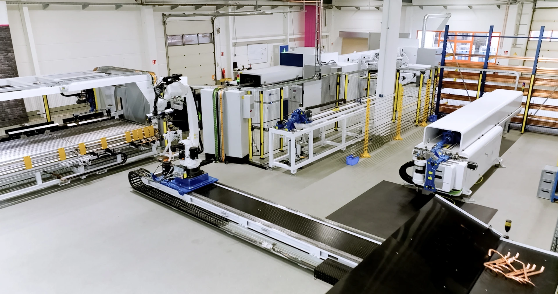 The solution was to cut the tubes with a TRUMPF Trulaser Tube 5000 and then transfer them automatically to the transfluid bending cell. The bending cell includes a conveyor section that can buffer up to 25 tubes of different lengths pre-cut by the laser. A robot transfers the tubes to a brushing station for cleaning and then to the bending machine. Tubes from 200-4500 mm in length can be processed in the bending cell. The TRUMPF nesting programme takes the data from the T project bending software from transfluid. This means that different lengths and diameters for different geometries can be produced in a single production run.