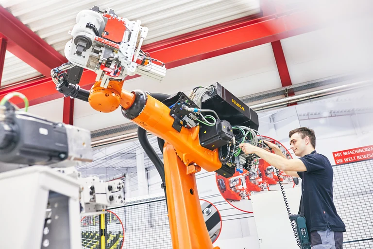 If a linear handling is not an option, the use of a robot that can handle loading and unloading in addition to the handling is usually the best decision. As an official KU- KA-system partner, transfluid can pass on years of expe- rience and know-how to its customers.